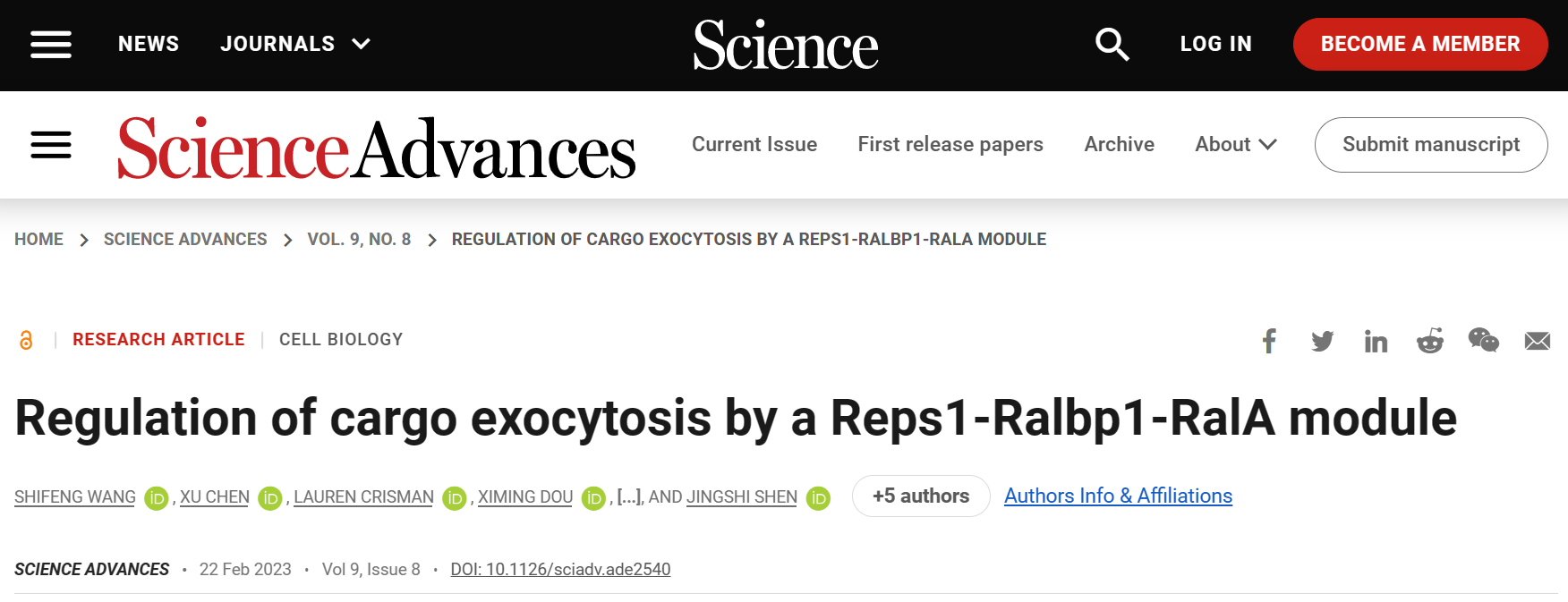 2023年2月22日,betway88西汉姆联青年教师王石峰博士以第一作者在Science Advances杂志上发表了题为“Regulation of cargo exocytosis by a Reps1-Ralbp1-RalA module”( http://www.science.org/doi/10.1126/sciadv.ade2540)的国际合作研究论文。该研究在全基因组水平进行了基因筛选,发现了调控细胞膜稳态的两个关键蛋白Reps1 和 Ralbp1。通过全内反射荧光成像(TIRF)和透射电子显微镜成像(TEM)等方法发现Reps1和Ralbp1主要通过介导胞吐作用来调控细胞膜蛋白平衡。敲除Reps1 或Ralbp1显著破坏细胞膜蛋白的平衡。机制研究发现Reps1与Ralbp1形成动态的蛋白复合物来调节 small GTPase RalA 的活性,通过调控RalA 与exocyst结合来促进胞吐作用。在原代大鼠神经元敲除Reps1影响神经细胞发育,从而导致神经网络无法正常形成。以上研究通过高通量基因筛选发现了细胞膜蛋白稳态的新调控因子Reps1和Ralbp1,并揭示了Reps1-Ralbp1-RalA 轴在胞吐作用中的分子机理,将有助于阐述Reps1突变引发神经退行性疾病的分子机制。