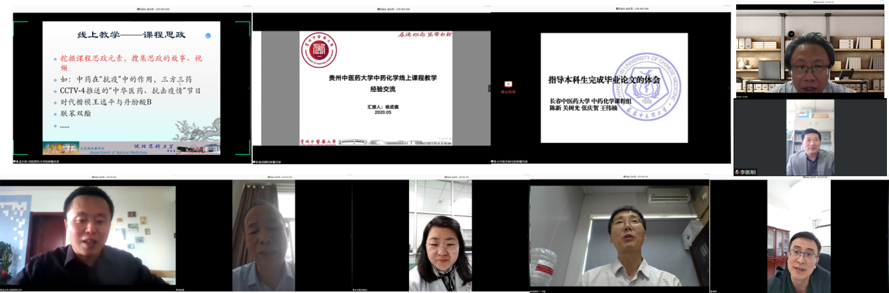 随后,来自长春、沈阳、湖南、贵州、广东等中医药高校的课程主讲教师对此次教学经验也进行了分享。沈阳药科大学的孟大利教授分享了所在的天然药化教研室的丰富的线上教学资源和平台,利用多样化且趣味性的教学模式调动员工线上学习的积极性和能动性;长春中医药大学关树光教授感谢中药化学课程联盟这个平台让教师能够在教学过程中及时的交流经验,同时她分享了指导本科生完成毕业论文的经验和建议;湖南中医药大学裴刚教授认为教学是设计出来的,并分享了在线上教学过程中建立互助小组等高效的教学环节;广州中医药大学的赵钟祥教授分享了线上教学中涉及的课程思政、课堂考核、毕业论文撰写等多个环节的教学经验;贵州中医药大学杨武德教授分享了此次线上教学过程中遇到的问题,落实“人心向学”理念,解决员工上网困难等问题。在自由讨论环节,来自河南、北京和上海等课程主讲老师也分享了自己的经验,河南中医药大学孙彦君教授分享了慕课建设的经验;上海中医药大学李医明教授分享了如何通过顶层设计来完善老员工的毕业设计环节和提高线上教学效果。