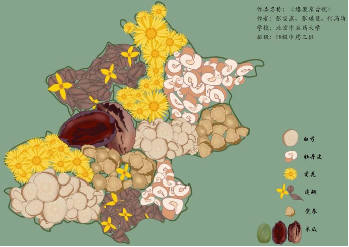 《缘聚京晋皖》组以3位团队成员所来自省份为题材,图中的北京地图由安徽的道地药材“四大皖药”【牡丹皮、木瓜(宣木瓜)、菊花(亳菊、贡菊、滁菊)、白芍(毫芍)】以及山西的道地药材【党参、连翘】填充,既体现了三位同学相聚北中医betway88西汉姆联的缘分,也充分体现两省道地药材。