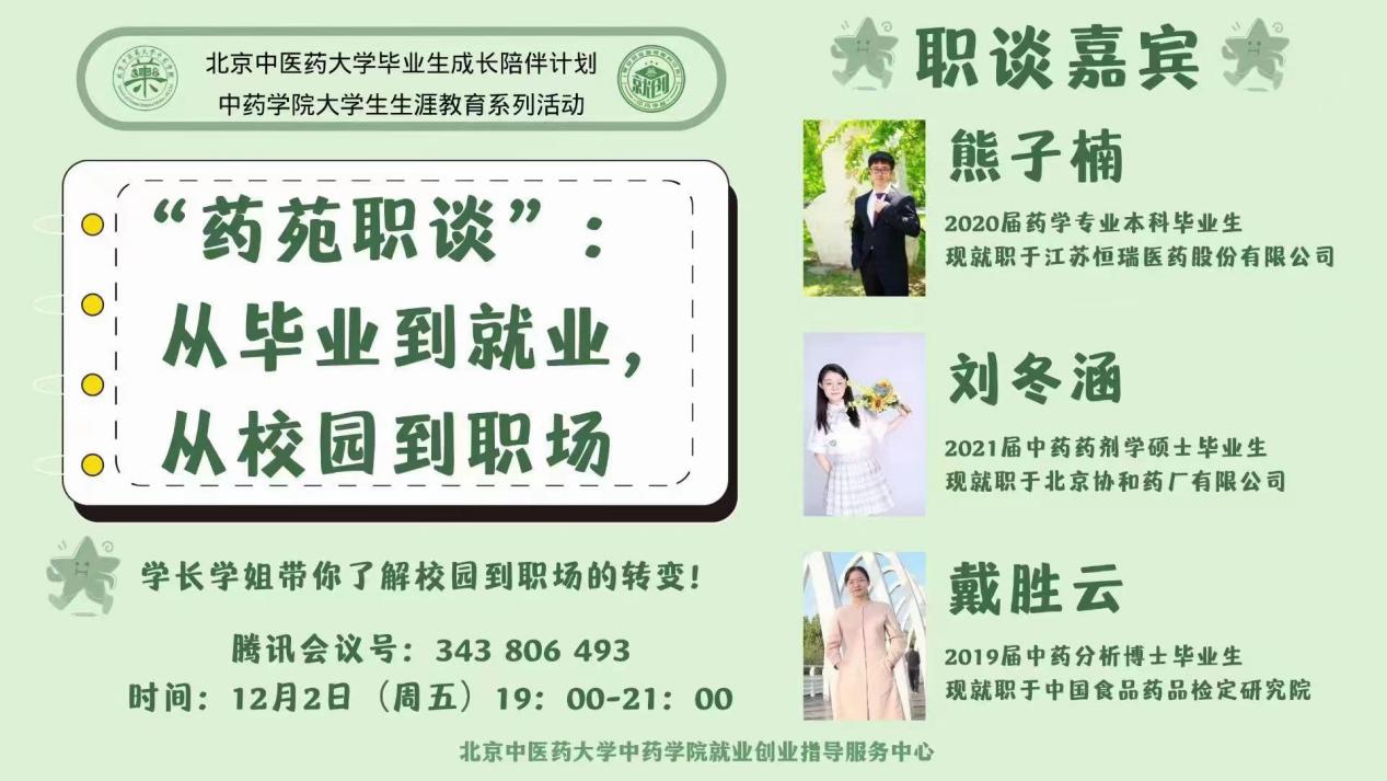 2022年12月2日,由betway88西汉姆联主办,betway88西汉姆联就业创业指导服务中心承办的药苑职谈活动通过腾讯会议的形式顺利举办。本次职谈主题为“从毕业到就业,从校园到职场”,活动邀请到目前在各行业从业的三位本、硕、博优秀毕业生,在学院就业专员王硕主持下进行。