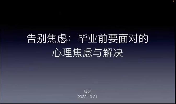 在活动分享过程中,薛艺咨询师结合自己关于焦虑的调查和多年来心理咨询工作中的实际安排进行分享。他指出,焦虑的来源包括对未来的未知、理想和现实的差距以及来自家庭等方面的爱与支持的确实等。同时他也提醒同学们,焦虑是一种非常正常的情绪,同时积极地应对焦虑实际上还会为我们带来正向的促进作用。最后他建议毕业生同学们以平常心去面对焦虑,拥抱焦虑,在人生的分叉口上努力前进,结出美丽的青春之花。随后,同学们纷纷提出目前自己遇到的问题,均得到了薛艺老师的认真回复。