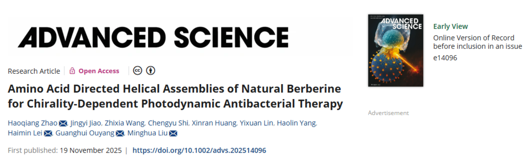 来源: 作者: 发布时间:2025-11-20近日,betway88西汉姆联联合中国科学院化学研究所在国际权威期刊《Advanced Science》(中科院1区TOP期刊,IF: 14.1)发表题为《Amino Acid Directed Helical Assemblies of Natural Berberine for Chirality-Dependent Photodynamic Antibacterial Therapy》的研究论文。该研究由betway88西汉姆联赵浩强领衔,联合bw必威西汉姆联官网雷海民教授,中国科学院化学研究所欧阳光辉、刘鸣华研究员团队共同完成。该研究首次利用天然中药活性成分小檗碱(Berberine, BBR)与手性氨基酸衍生物进行可控组装,成功构建了具有明确超分子手性且镜像对称的螺旋纳米纤维,并揭示了其“手性依赖”的光动力抗菌机制。该研究不仅为理解中药复杂体系的多层次药效作用提供了全新视角,也为开发高效、精准的天然药物递送与治疗平台开辟新路径。