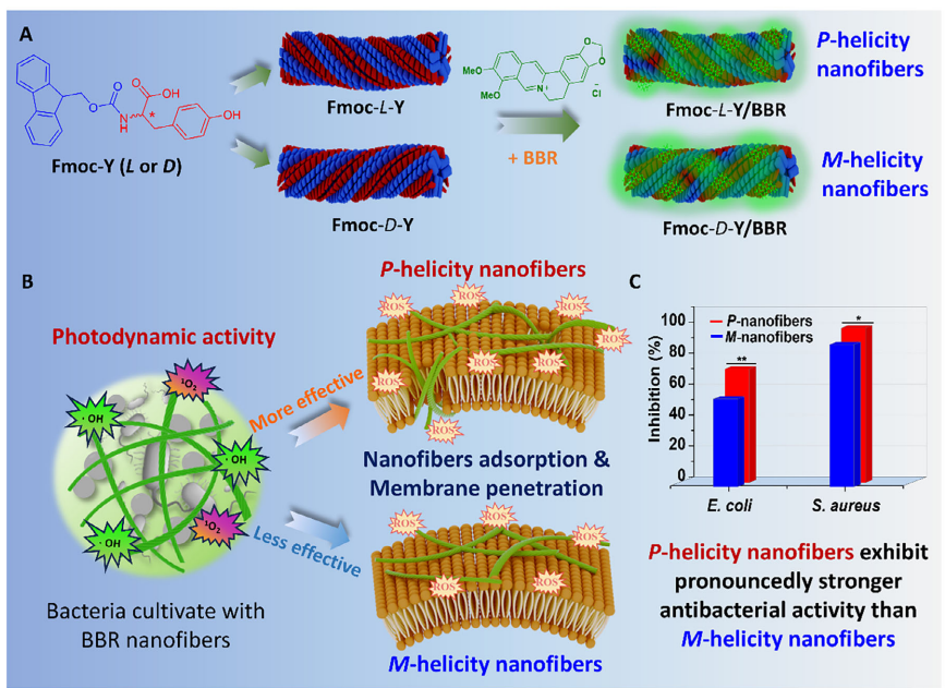 手性是生命体系的本质属性,从DNA的双螺旋结构到细胞膜中磷脂的有序排列,生命物质普遍呈现出明确的手性偏好。在药物化学领域,分子的手性构型直接决定其与生物靶点之间的“锁钥”匹配关系,从而深刻影响药理活性、安全性及体内行为。相较于合成药物中对手性的系统研究,当前中药领域的研究仍主要集中在单一活性成分的化学结构与药理作用上。近年来,随着超分子化学被引入中药研究,逐渐形成新的研究热点。但现有工作多关注聚集终态的纳米/微米结构及其生物活性表征,对中药活性成分在超分子手性层次的效应及其生物学功能目前尚无报道。本研究首次将中药活性分子BBR与手性模板Fmoc-Y共组装,构建了具有可控手性(左旋/右旋)的螺旋纳米纤维,并发现右旋纳米纤维可通过手性匹配原理高效靶向细菌膜,显著增强光动力抗菌效果。这一发现填补了中药超分子手性生物学效应研究的空白,为理解中药多层级药效机制提供了新视角。