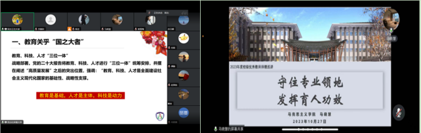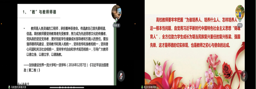 周芬副教授在报告中指出,教育是人民幸福、国家富足的基础,作为教育的直接传播者,教师应该牢记自己的使命,坚持四个相统一,履行新时代高校教师职业行为十项准则,做一位优秀的灵魂塑造者。马晓慧老师也强调,教乃是上所施,下所效也。教师应注重自身德行,以德立身,以德立学,以德施教,精业笃行,促进教学创新,将教书与育人并重。周老师和马老师的报告让在座的青年教师深受鼓舞。